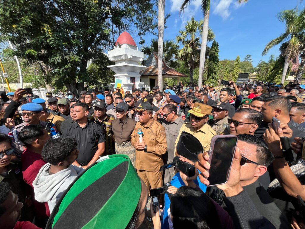 Gubernur NTT, Melki Laka Lena, bersama Wakil Gubernur NTT, Johni Asadoma dan Ketua DPRD Provinsi NTT, Emi Nomleni, pimpinan fraksi, anggota DPRD, serta seluruh jajaran Forkopimda, meninggalkan ruang kantor dan berdiri sejajar di hadapan massa.